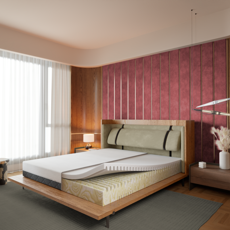 1. Italská paměťová pěna s hustotou 80 kg/m³ - vysoce kvalitní paměťová pěna, která výrazně převyšuje běžné standardy (40–50 kg/m³), což zajišťuje výjimečnou měkkost, poddajnost a dlouhodobou stálost.