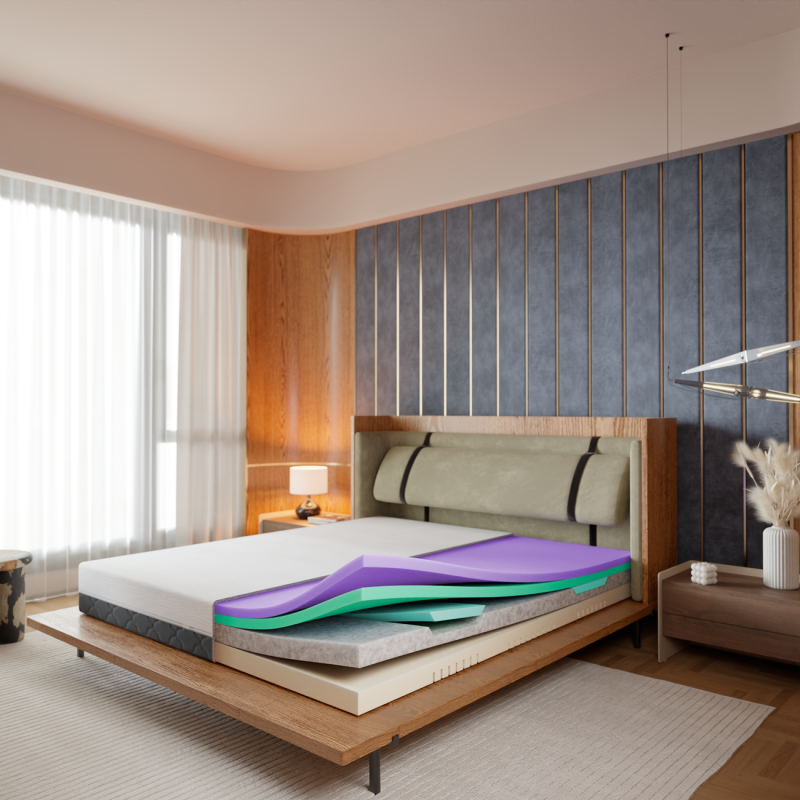Matrace je složená z několika vrstev, které spolu tvoří celek zaměřený na pohodlí i oporu. Dvě studené pěny ve spodní části, včetně prémiové Tiger touch, vytvářejí pevný a stabilní základ. Nad nimi je měkčená oblast v ramenní části, která nechá tělo uvolnit se tam, kde je to nejdůležitější – bez tlaku, s přirozeným srovnáním páteře i dýchacích cest.