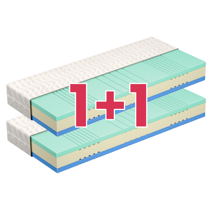 Matraci je možné v rámci Akce 1+1 kombinovat s dalšími typy a rozměry matrací. To je vhodné například pro partnery, mezi kterými je větší váhový rozdíl, nebo mají každý jiné nároky na své lůžko, případně když matrace nekupujete do jedné postele (například jednu matraci pro dítě do pokojíčku a druhou třeba pro prarodiče).