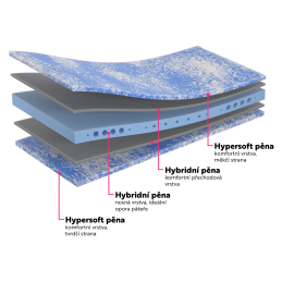 Je složená z pěti kvalitních vrstev, které spolu vytvářejí příjemně vyvážený celek – dvě měkčí Hypersoft pěny, dvě tenké přechodové vrstvy pro vyrovnání tlaku a uprostřed tužší hybridní pěna, která drží tvar a dodává pevnost.
